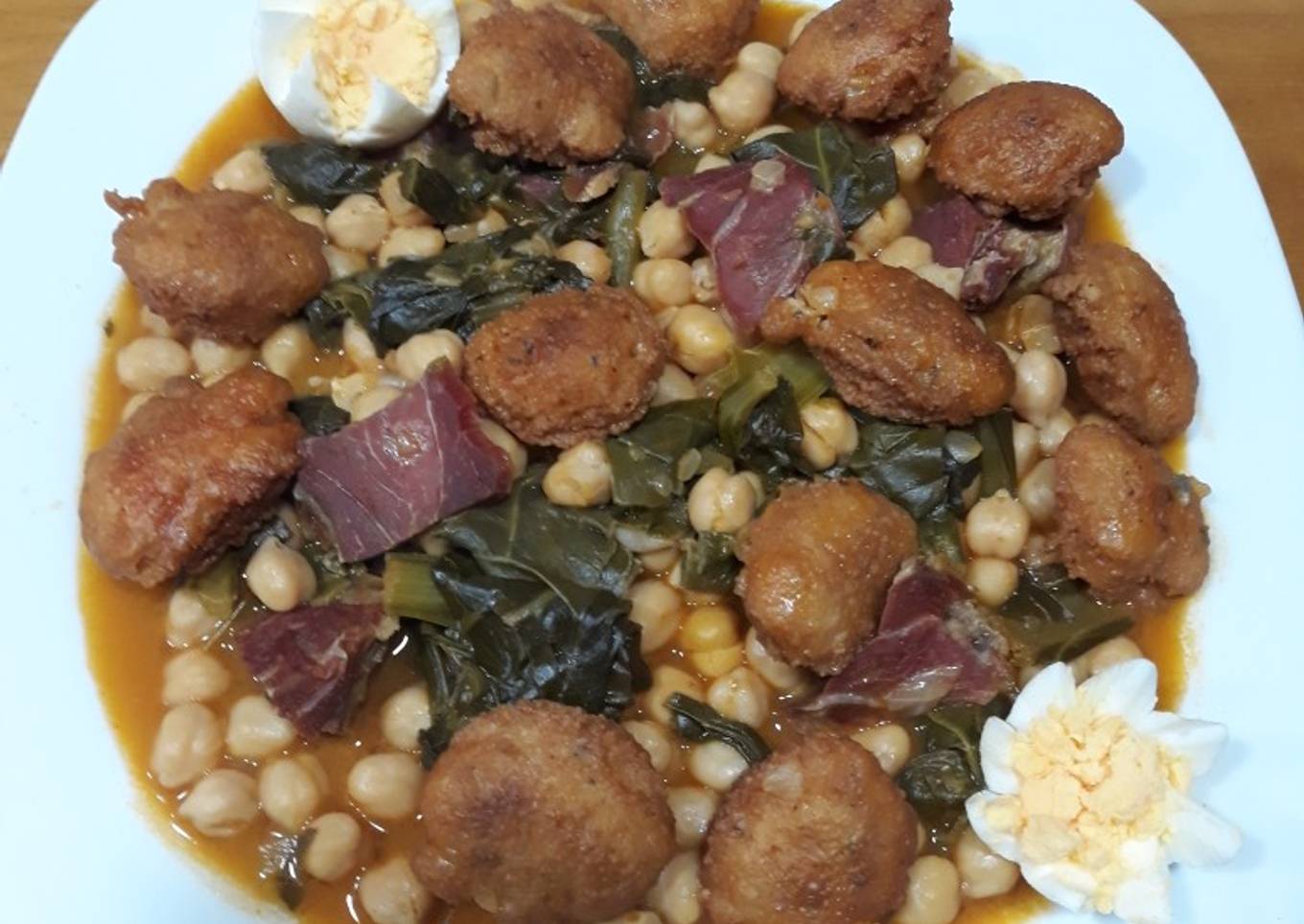 Potaje de garbanzos con jamón y albóndigas de pan y huevo