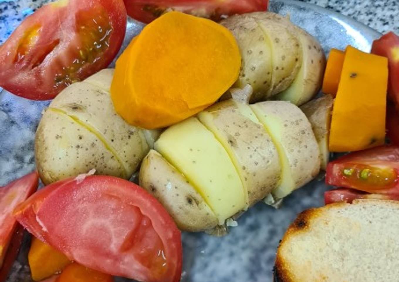 - Ahora vamos a emplatar. Ponemos cortadas en rodajas las papas y algunos boniatos. Cortamos en cuartos los tomates, ponemos los panes y a una tapa le ponemos mayonesa y encima la hamburguesa. Arriba de ella ponemos las zanahorias. Le ponemos un poco arriba del tomate, la papá, y el boniato un poco de sal y aceite de oliva especial. Y también ponemos un poco en la tapa del pan.