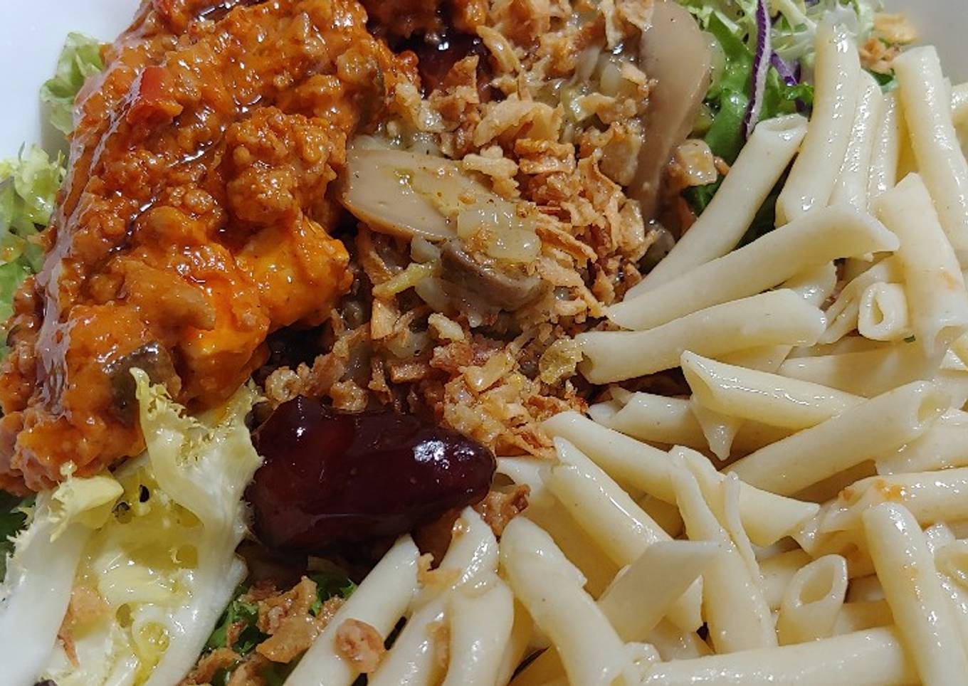 Steps to make to make Ensalada mezclum con pasta, dátiles y boloñesa