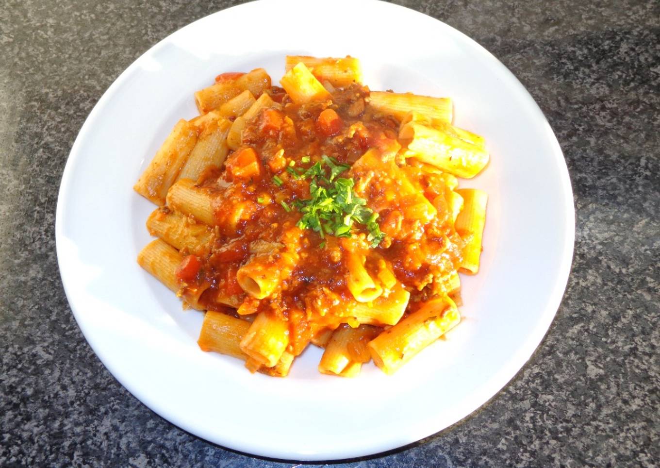 Poner los canutos de vuelta en la olla y mezclar con la mitad de la salsa boloñesa.