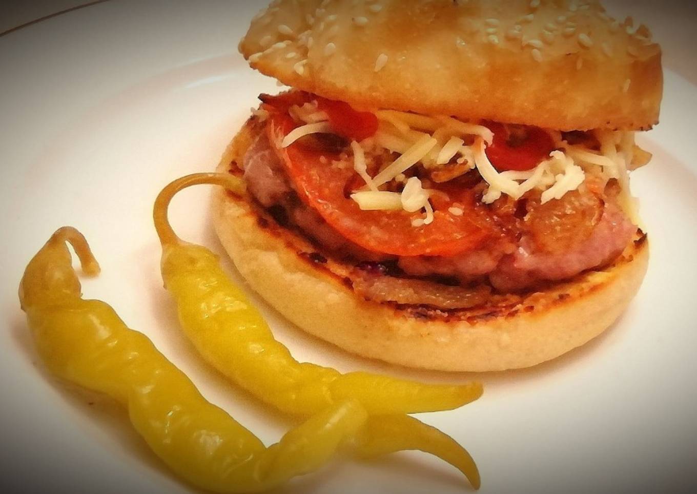 - Regamos con el ketchup y tapamos con la parte superior del pan, ya podemos disfrutar de nuestra querida hamburguesa, acompañamos con las piparras picantitas, me encantan !!!