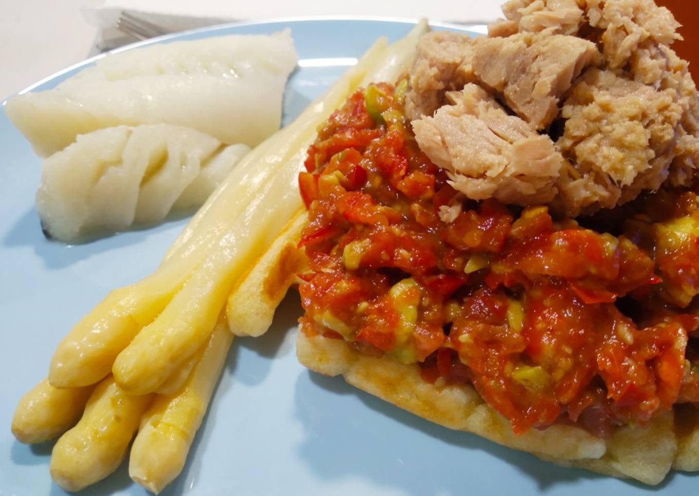 - Por último vamos a emplatar colocando sobre cada gofre unas cucharadas de picadillo. Unas con el que lleva pepino y otras con en el otro que cubriremos finalmente con el atún